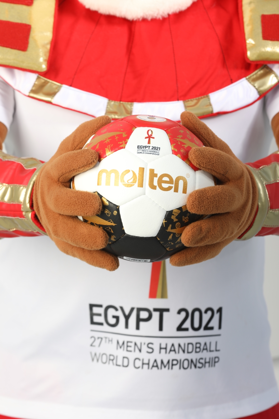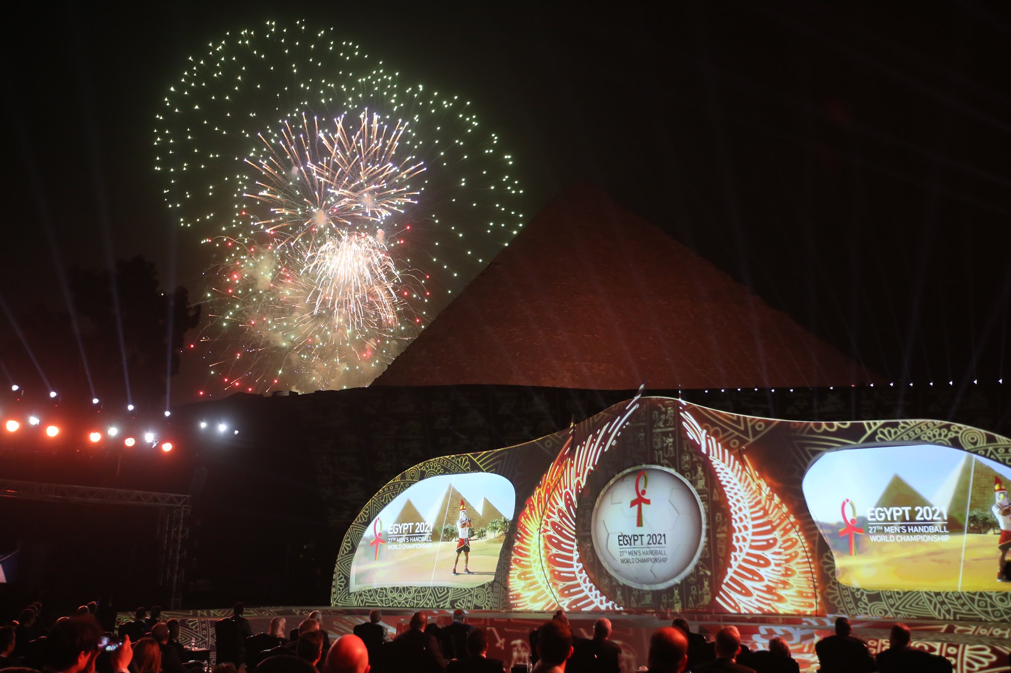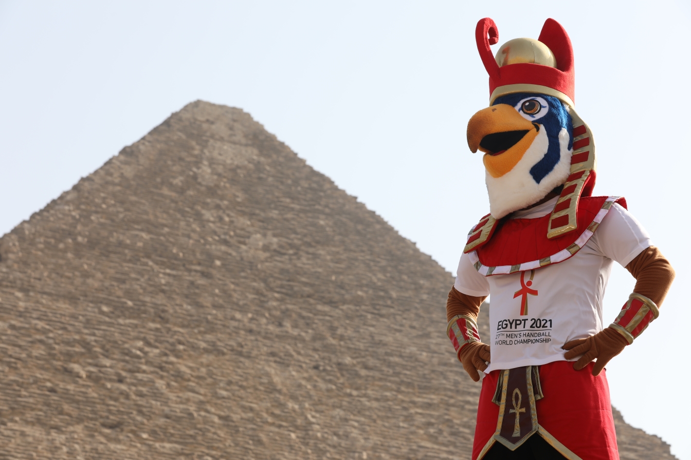 The Mascot of the competition, Handball HORUS, performs a Pharaonic dance in front of the Great Pyramids of Giza in Egypt during the official draw before the compeition. A lot of celebrations with international spectators, while keeping safety precautions due to the pandemic.
